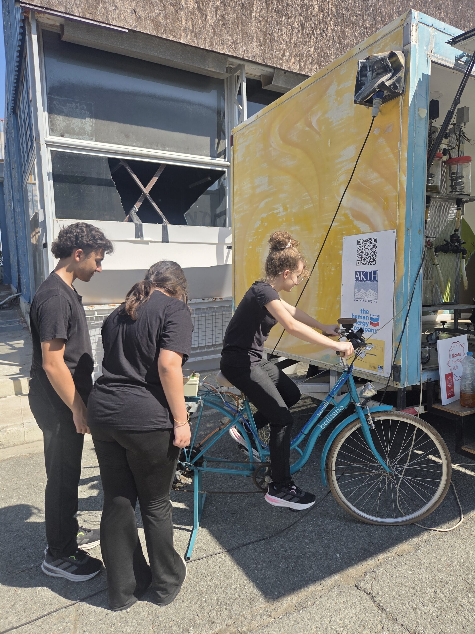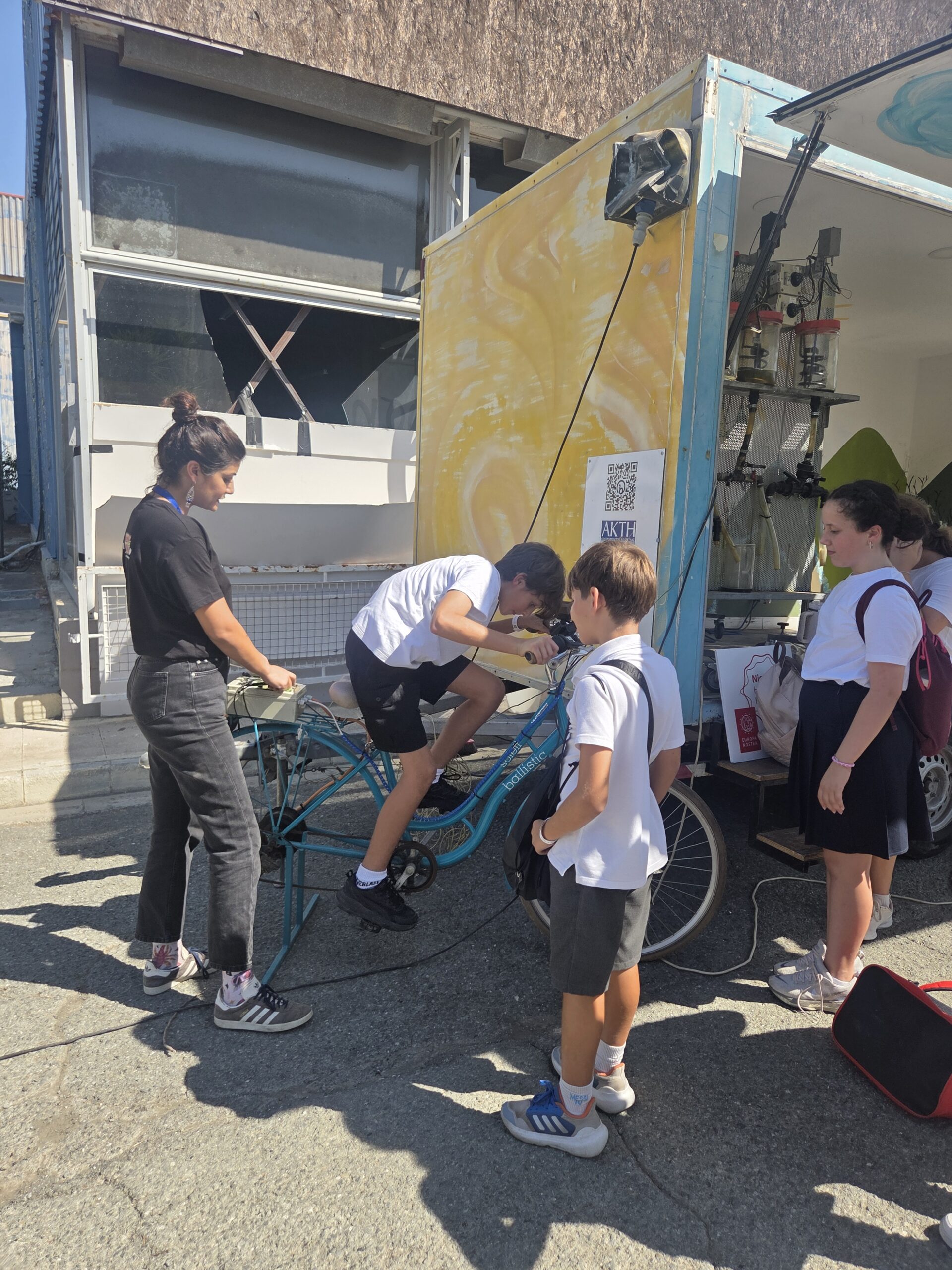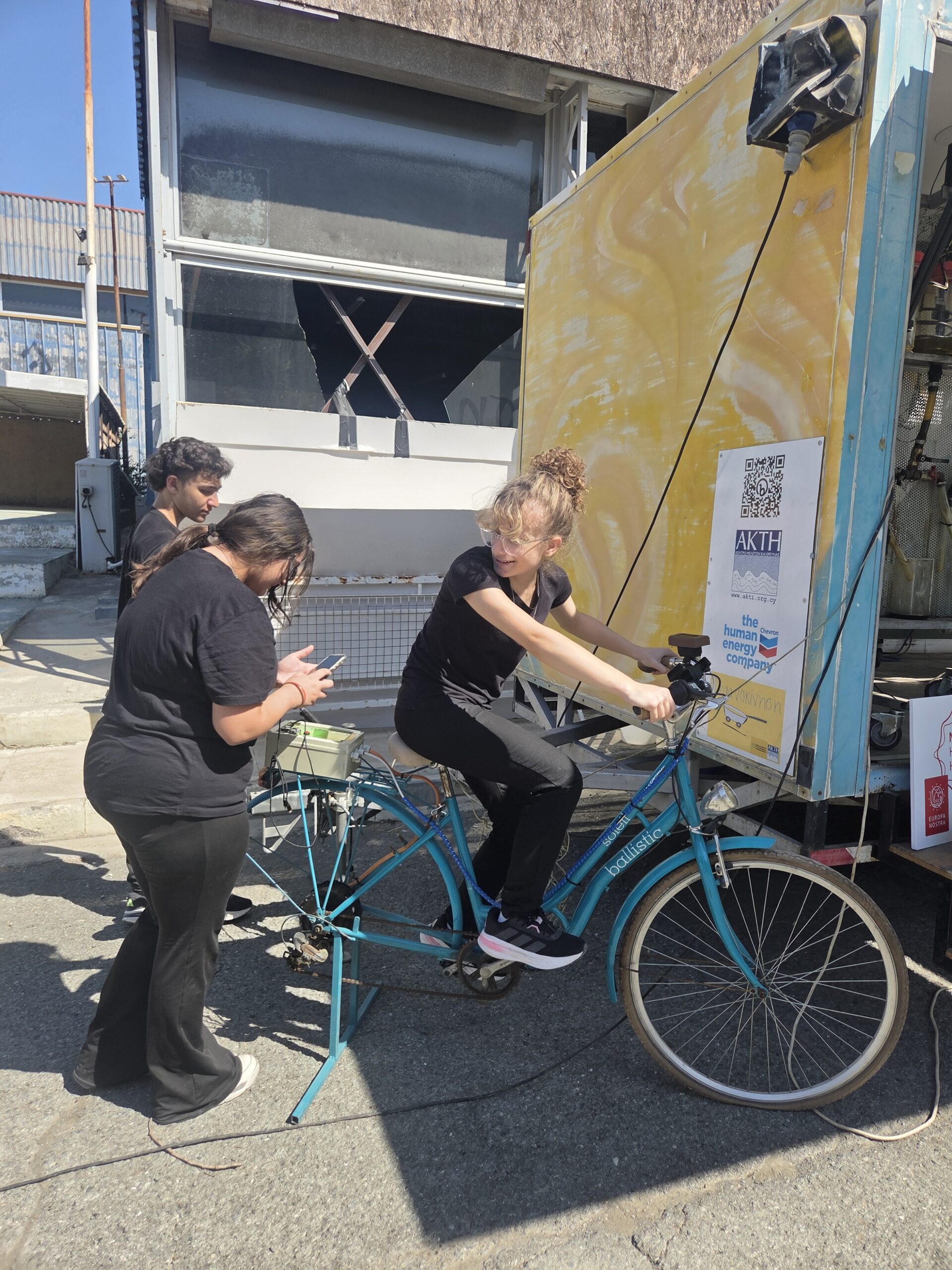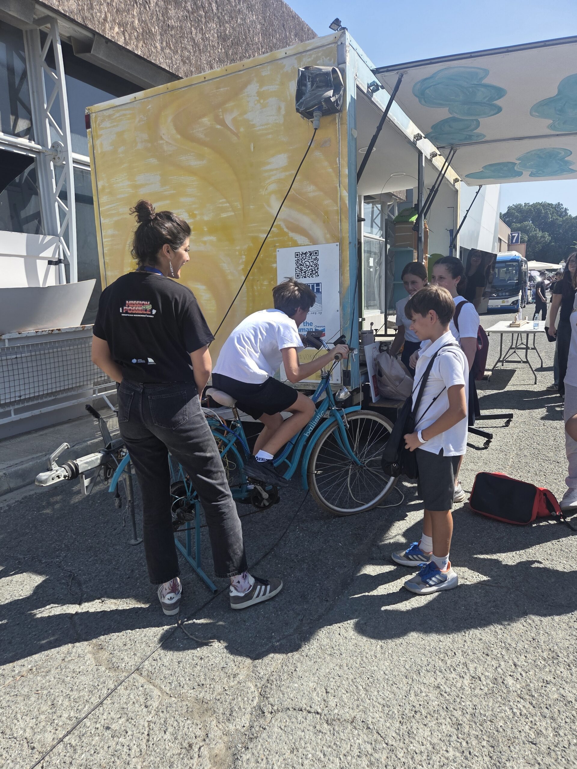 Η μέρα ξεκίνησε με την παρουσίαση της νεότερης προσθήκης στο καραβάνι, το ποδήλατο που μετατράπηκε σε σταθμό φόρτισης. Ένα συναρπαστικό παράδειγμα ανακύκλωσης και καινοτομίας, που δείχνει πως η ανθρώπινη ενέργεια από την ποδηλασία μπορεί να μετατραπεί σε ηλεκτρισμό για να τροφοδοτεί συσκευές σε πραγματικό χρόνο.