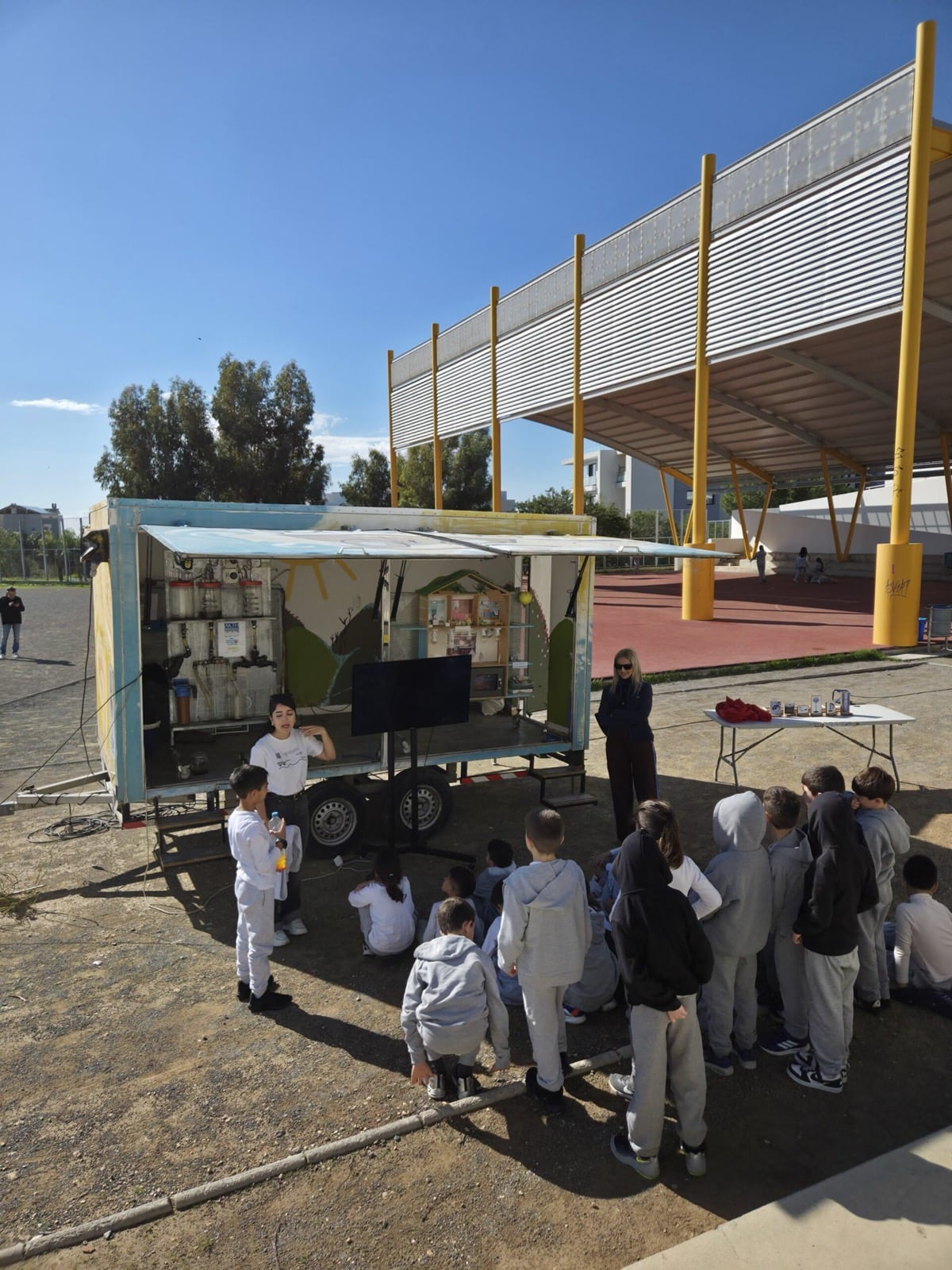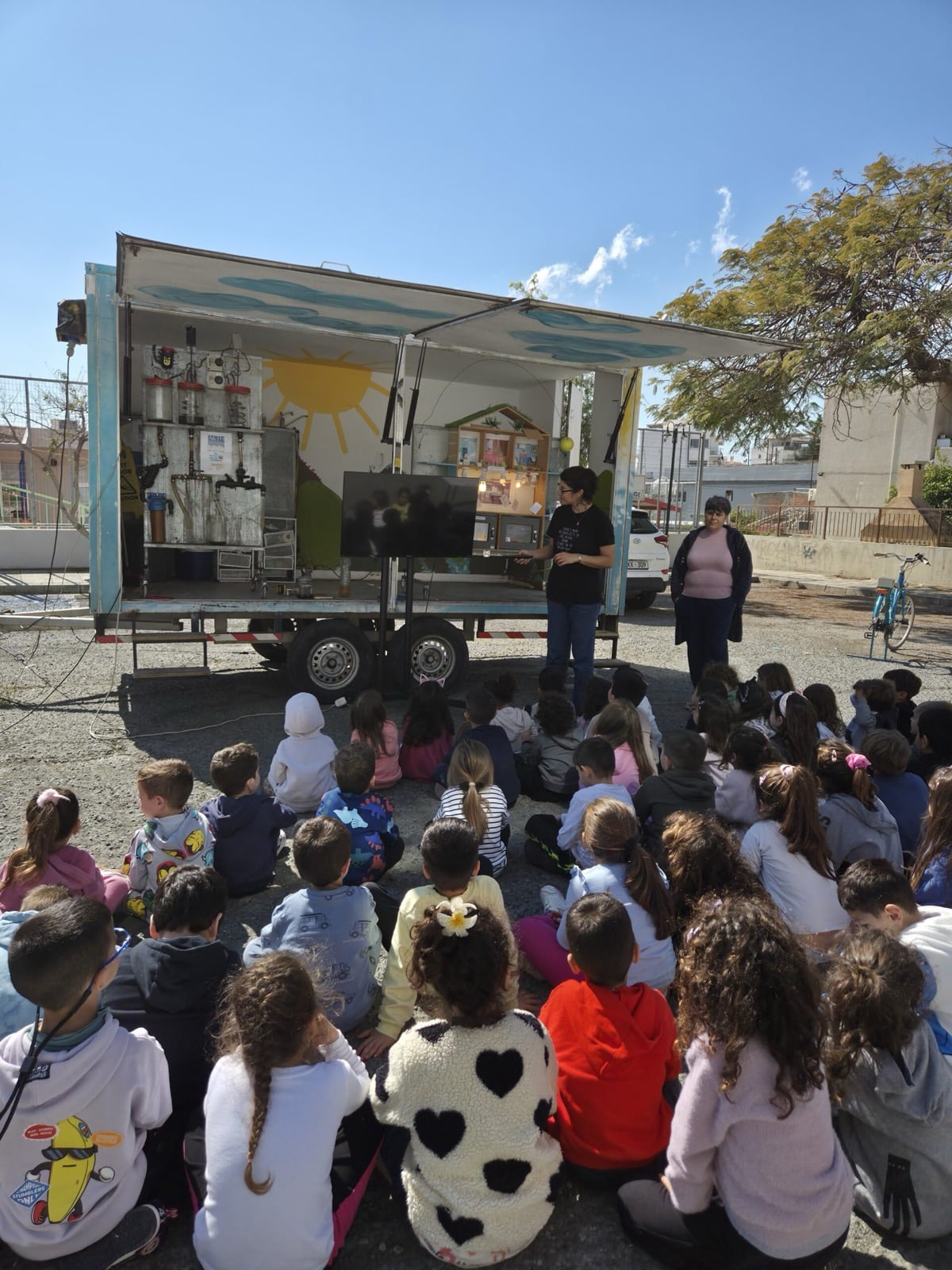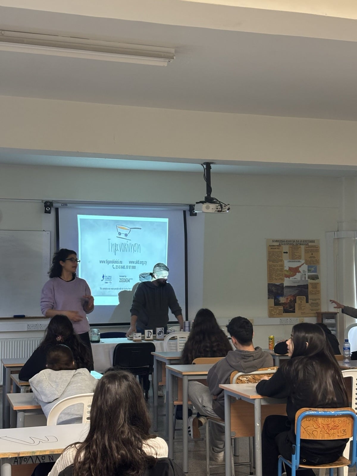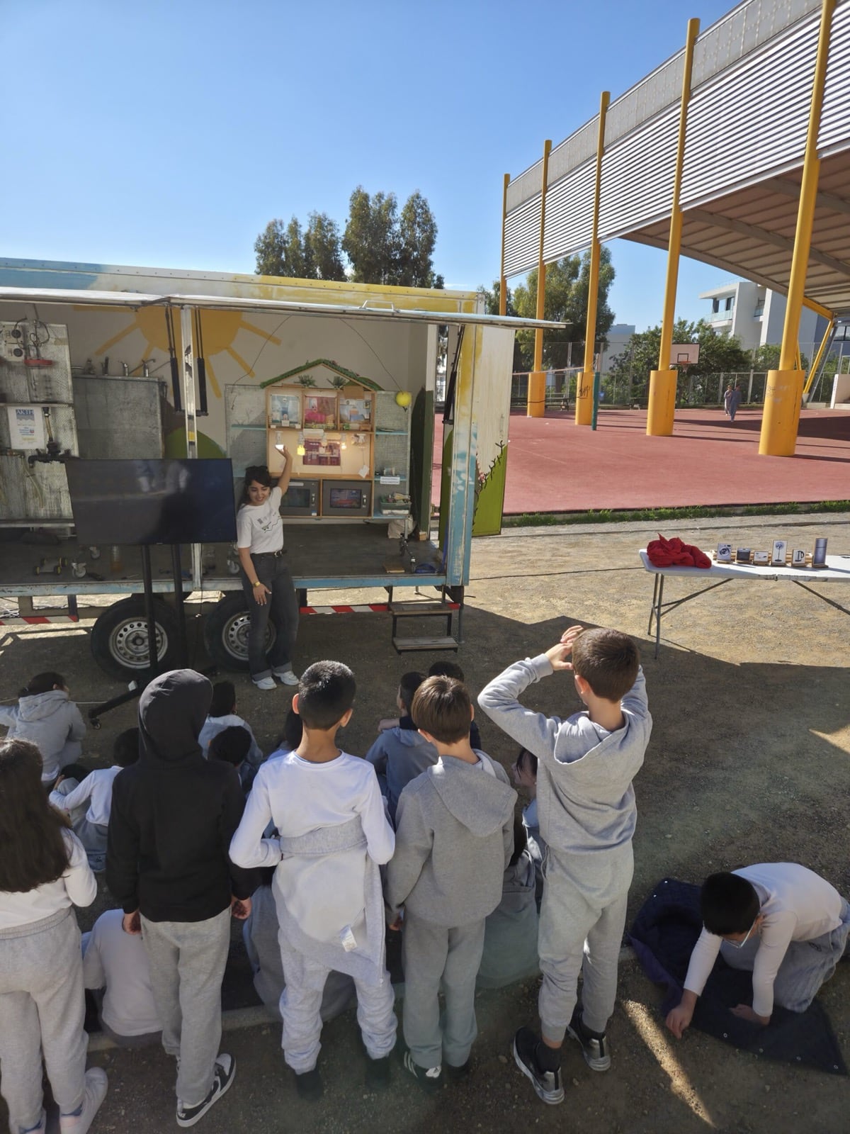 All the schools warmly welcomed the Tiganokinisi caravan. At Linopetra Gymnasium, however, the weather was not on our side, as the rain did not allow us to carry out the presentation outdoors. We therefore continued inside the classroom, where the children participated with the same interest and enthusiasm.