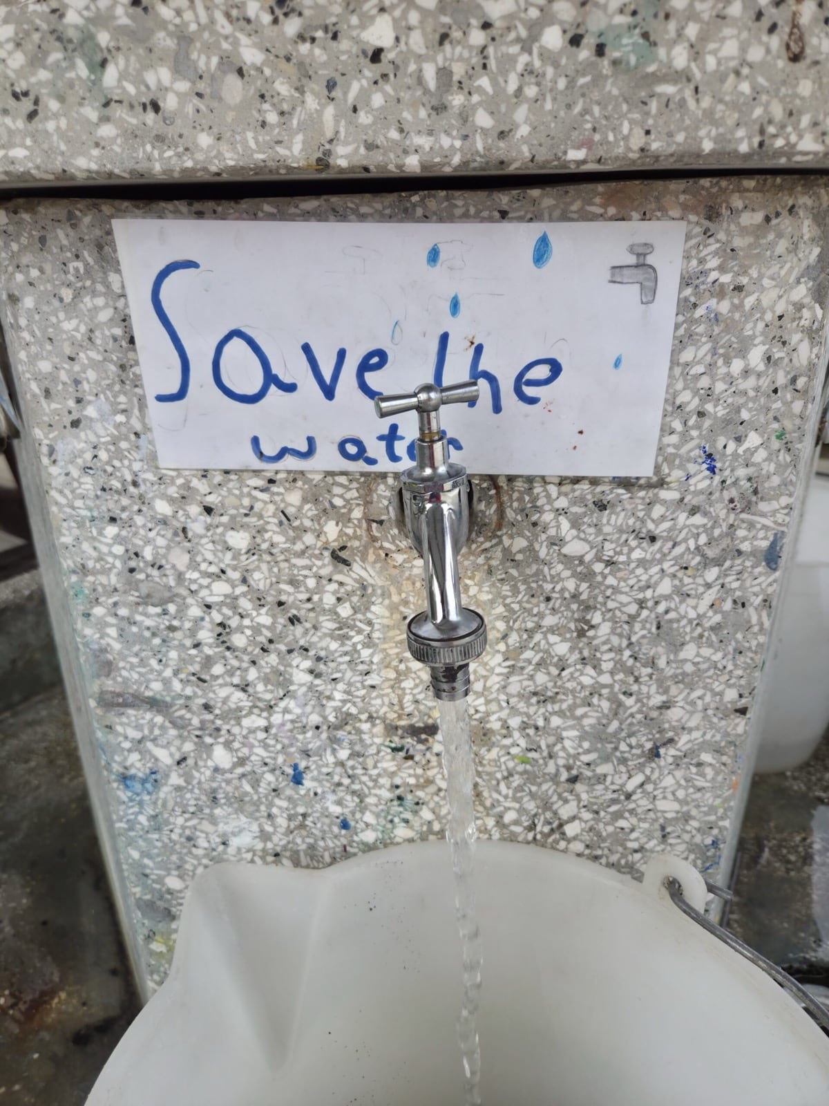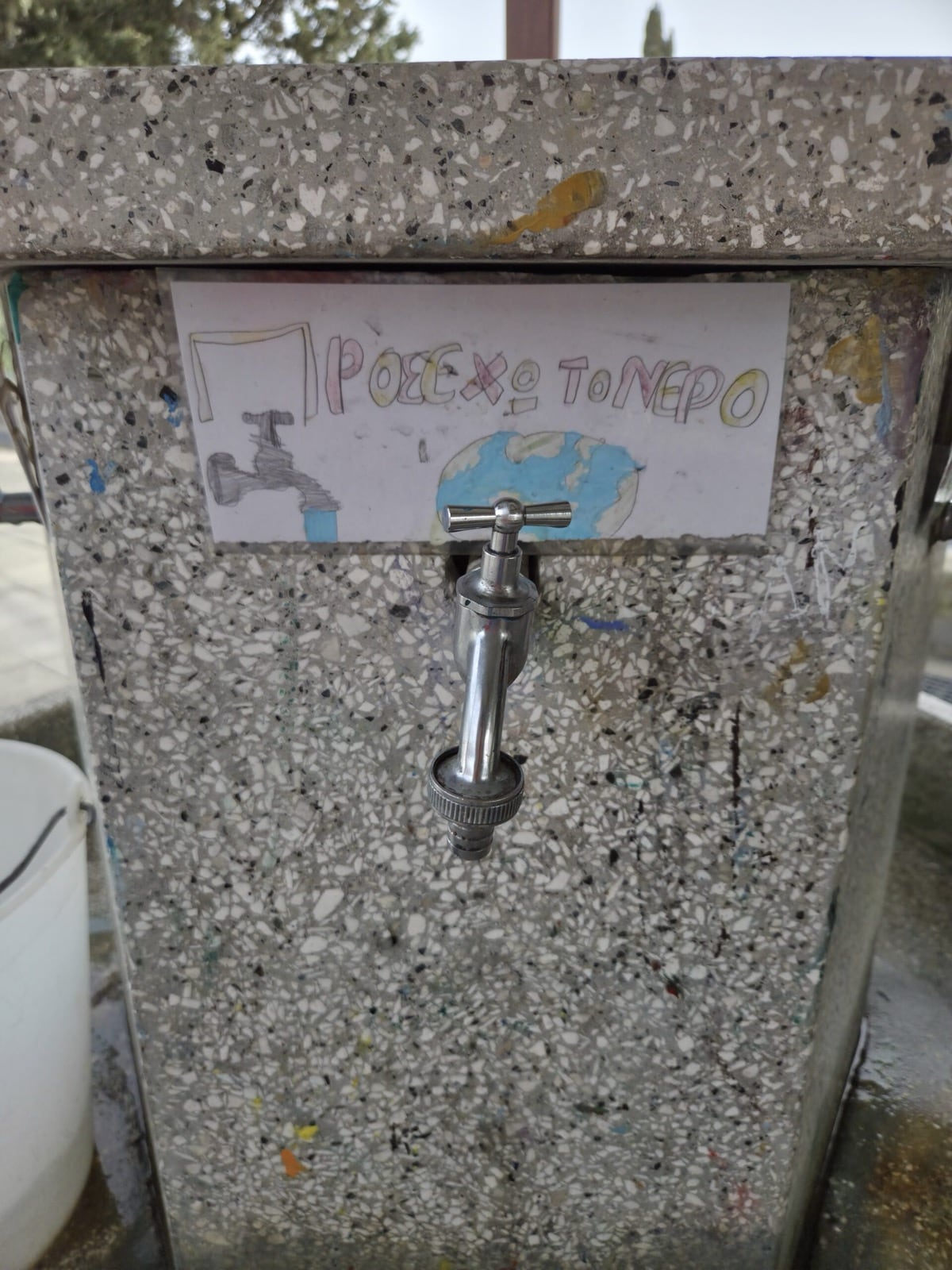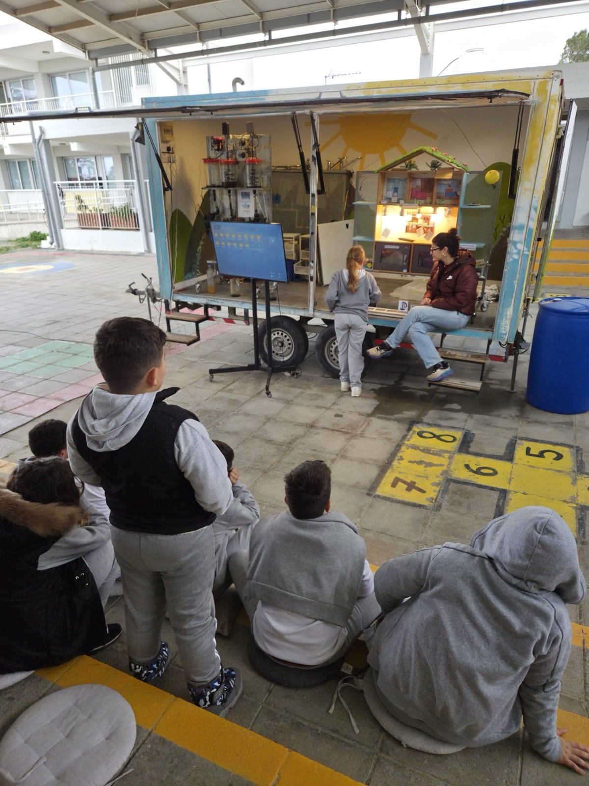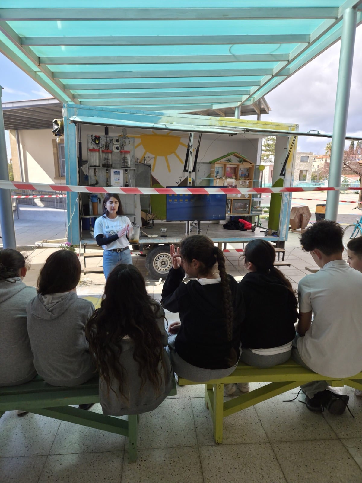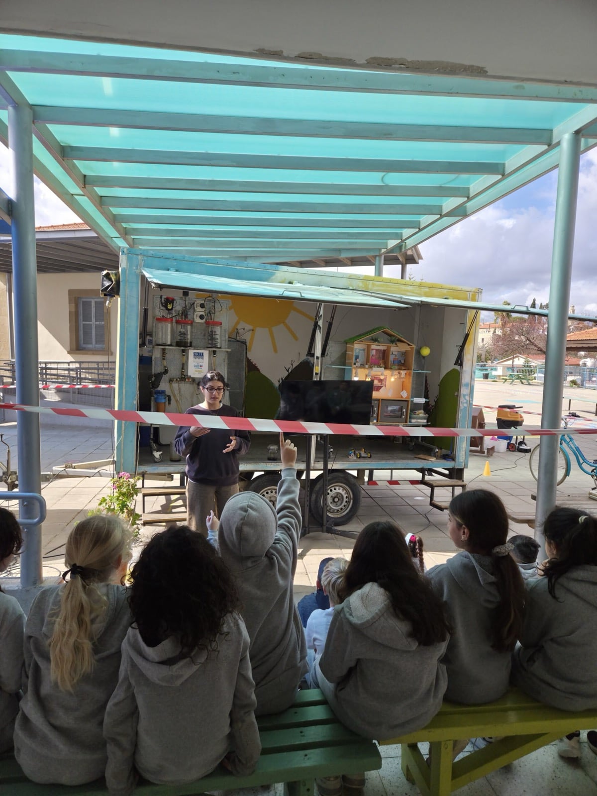 At Kofinou Primary School, we were pleased to observe that the outdoor taps displayed water-saving messages in Greek, English, and Arabic, reinforcing students’ environmental awareness and promoting responsible water use. In addition, children in both Kofinou and Zygi had the opportunity to see the Tiganokinisi barrel on site, where used cooking oil is collected.